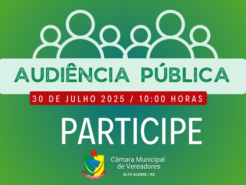 A CÂMARA MUNICIPAL DE ALTO ALEGRE, Estado do Rio Grande do Sul, Pessoa Jurídica de Direito Público, com sede na Rua Abelino Pagnussatt, nº 200, centro, na cidade de Alto Alegre/RS, inscrita no CNPJ sob nº 13.677.970/0001-78, representada por seu Presidente, Sr. José Raimundo Dressler, no uso de suas atribuições, convoca a comunidade em geral para a Audiência Pública do Poder Legislativo a ser realizada no dia 30/07/2025, com início às 10:00 horas, tendo como local o Plenário da Câmara Municipal de Vereadores de Alto Alegre, a Audiência Pública é referente ao Relatório de Gestão Fiscal (RGF) e Relatório Resumido da Execução Orçamentária (RREO) do 1º Semestre de 2025.